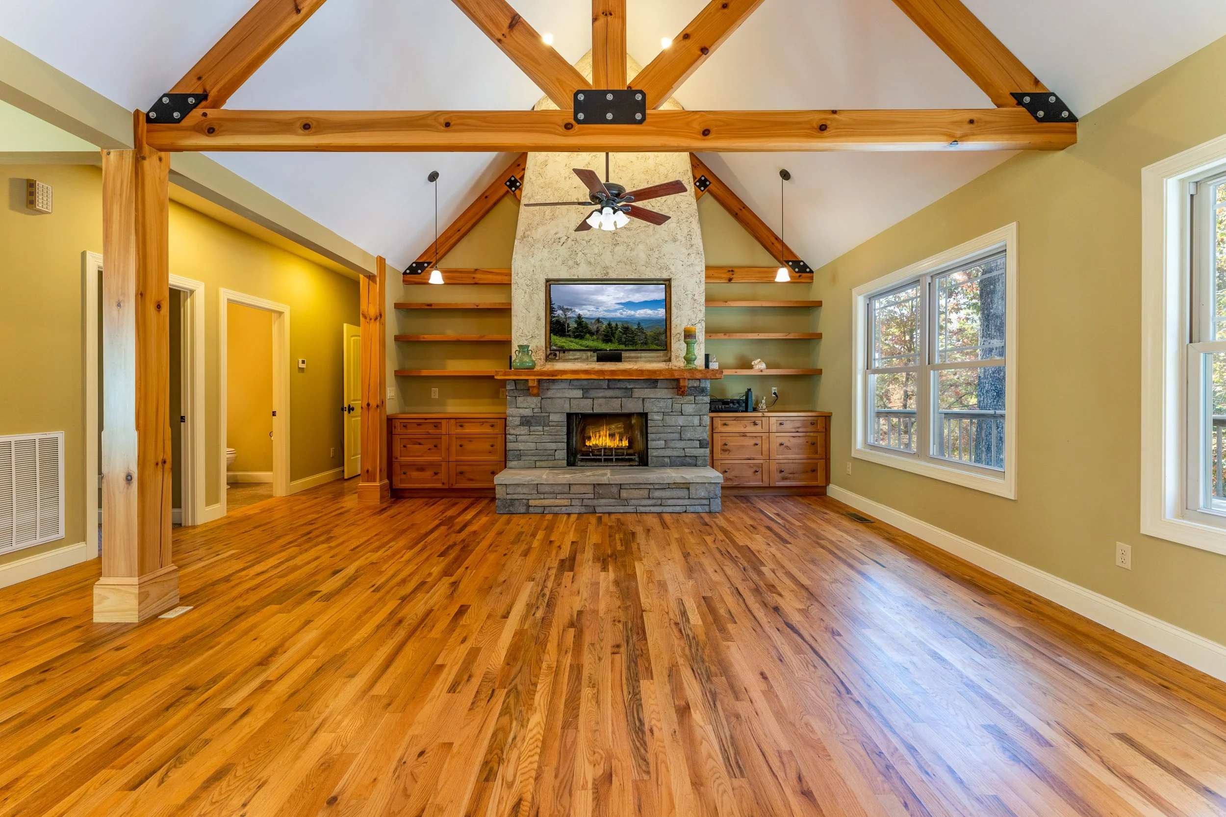 This transformation reimagines the room with a softer, more cohesive design while highlighting the home’s beautiful architectural features. The walls have been updated with Benjamin Moore Driftwood (2107-40), introducing a warm, natural tone that complements the rich hardwood floors and stone fireplace. To brighten and modernize the ceiling structure, both the ceiling and exposed beams were finished in Sherwin-Williams Pure White (SW 7005), creating a clean contrast that enhances the height and openness of the vaulted space.