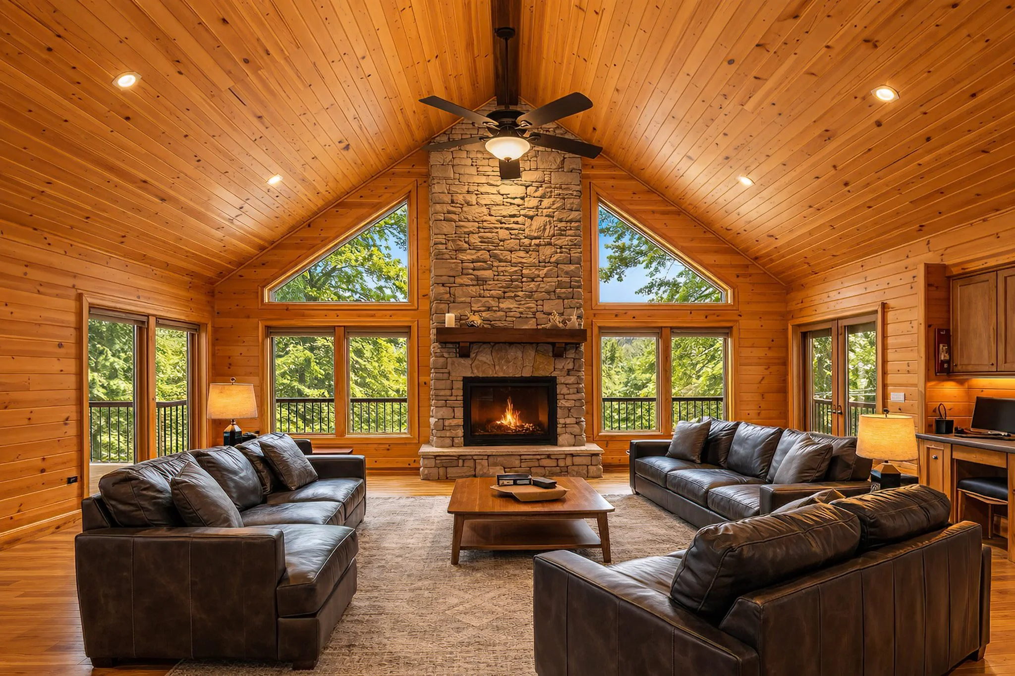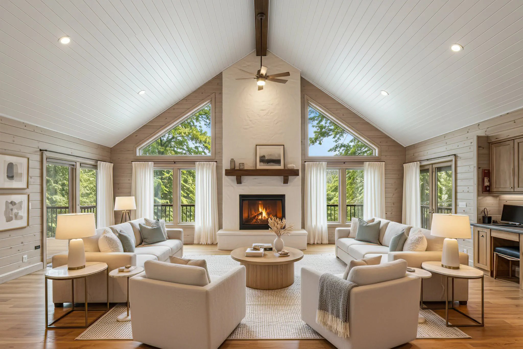 The resulting space is a Transitional Masterpiece. It retains the cozy, "lodge" feel through the exposed wood grain and structural beams but introduces a high-end, "broad-market" appeal that is bright, uncluttered, and sophisticated.