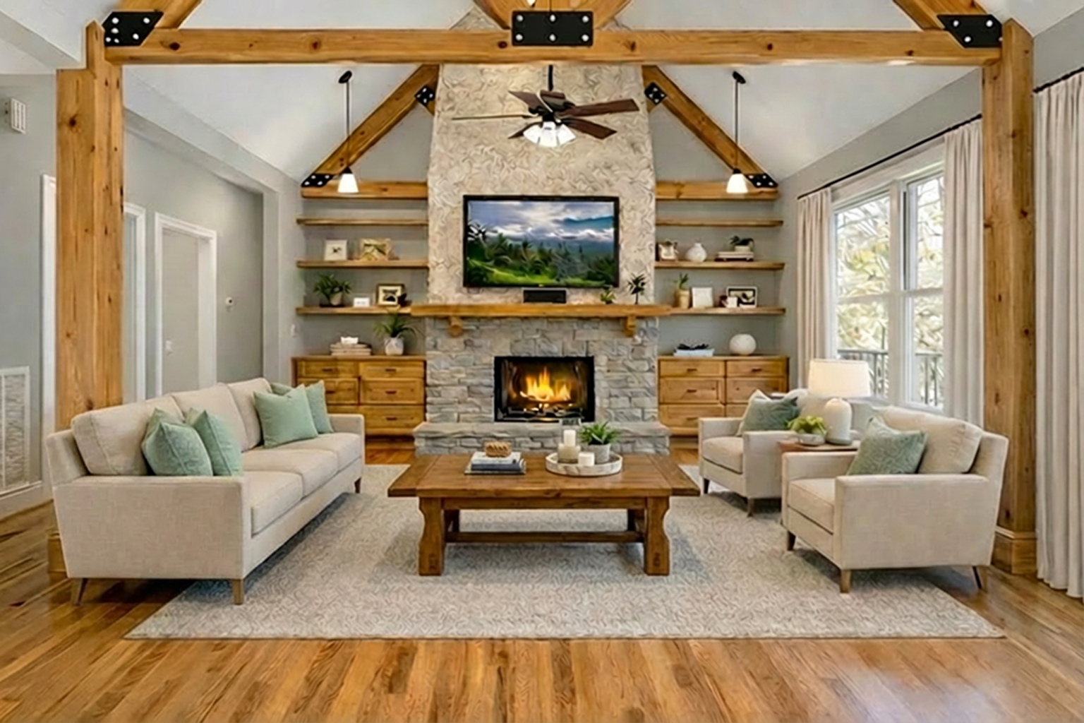 To enhance the home's livability, the original heavy furniture has been swapped for a lifestyle-neutral aesthetic. The new layout features a plush, cream-colored sectional and refined accent chairs in soft grey tones, all grounded by a textured natural-fiber rug. These pieces are strategically placed with realistic contact shadows to ensure a natural, "lived-in" appearance. The addition of a sleek, light-wood dining set and minimalist light fixtures completes the look, inviting prospective buyers to envision themselves relaxing by the stone fireplace in a space that feels both cozy and impeccably updated.